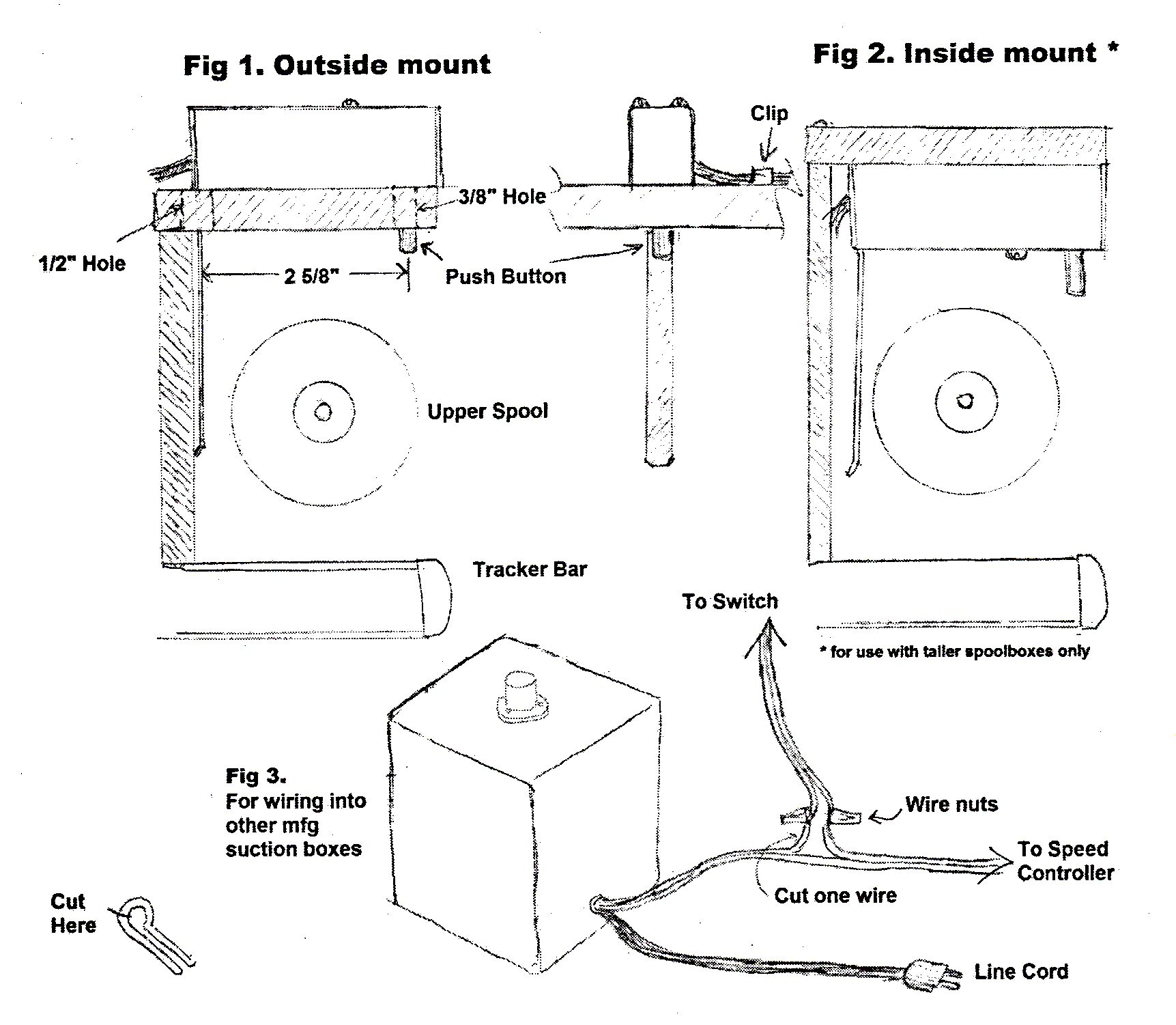 Follow these instructions if you are mounting the switch on top of the spoolbox. See figure 1 below. First find the location where the roll tab will hit the switch tab. This can be done by putting a roll in and using the eyelet on the roll as a guide, draw a center pencil line on the inside of the top cover. Also mark where the spoolbox back meets the top. Where these two lines meet is where you will drill a hole for the actuator tongue.